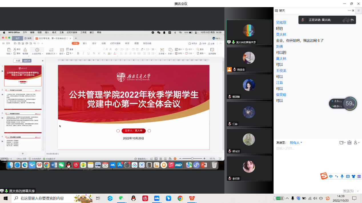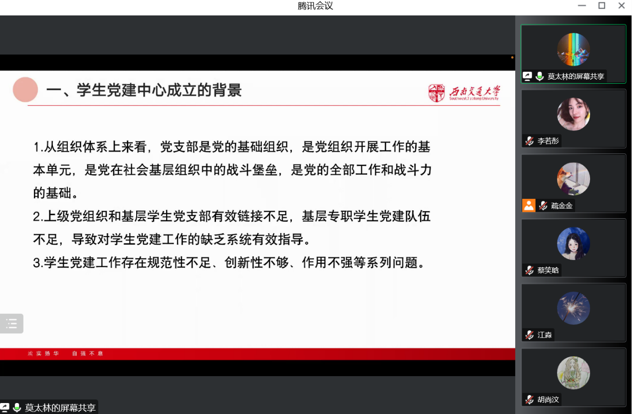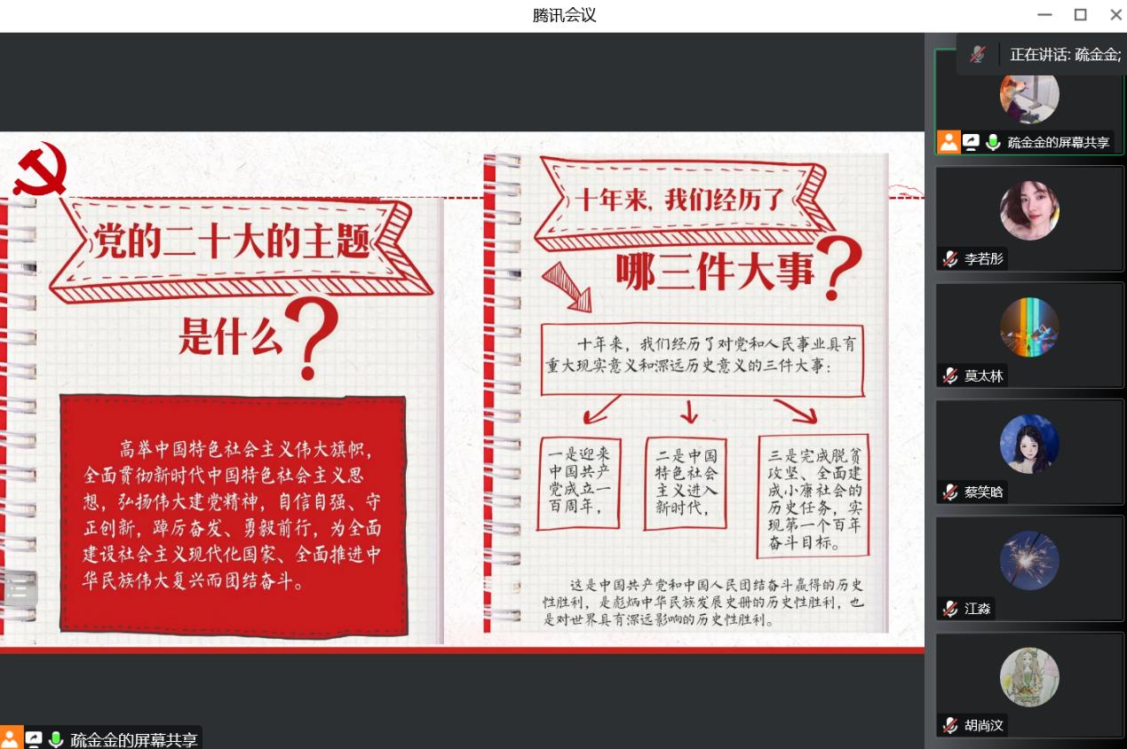 为深入学习贯彻党的二十大报告的主要内容和精神内涵,引导激励广大学生党员坚定理想信念,更好地立足岗位、履行职责,将崇尚先进、学习先进、争当先进的热情与干劲,凝聚成干事创业的力量,实现全面从严治党向纵深推进,2022年10月20日下午14:00在腾讯会议开展“必赢bwin线路检测中心官网学生党建发展指导中心第一次全体大会”,以实际行动践行党的二十大精神。本次会议由莫太林老师主持,党建中心全体成员参加。